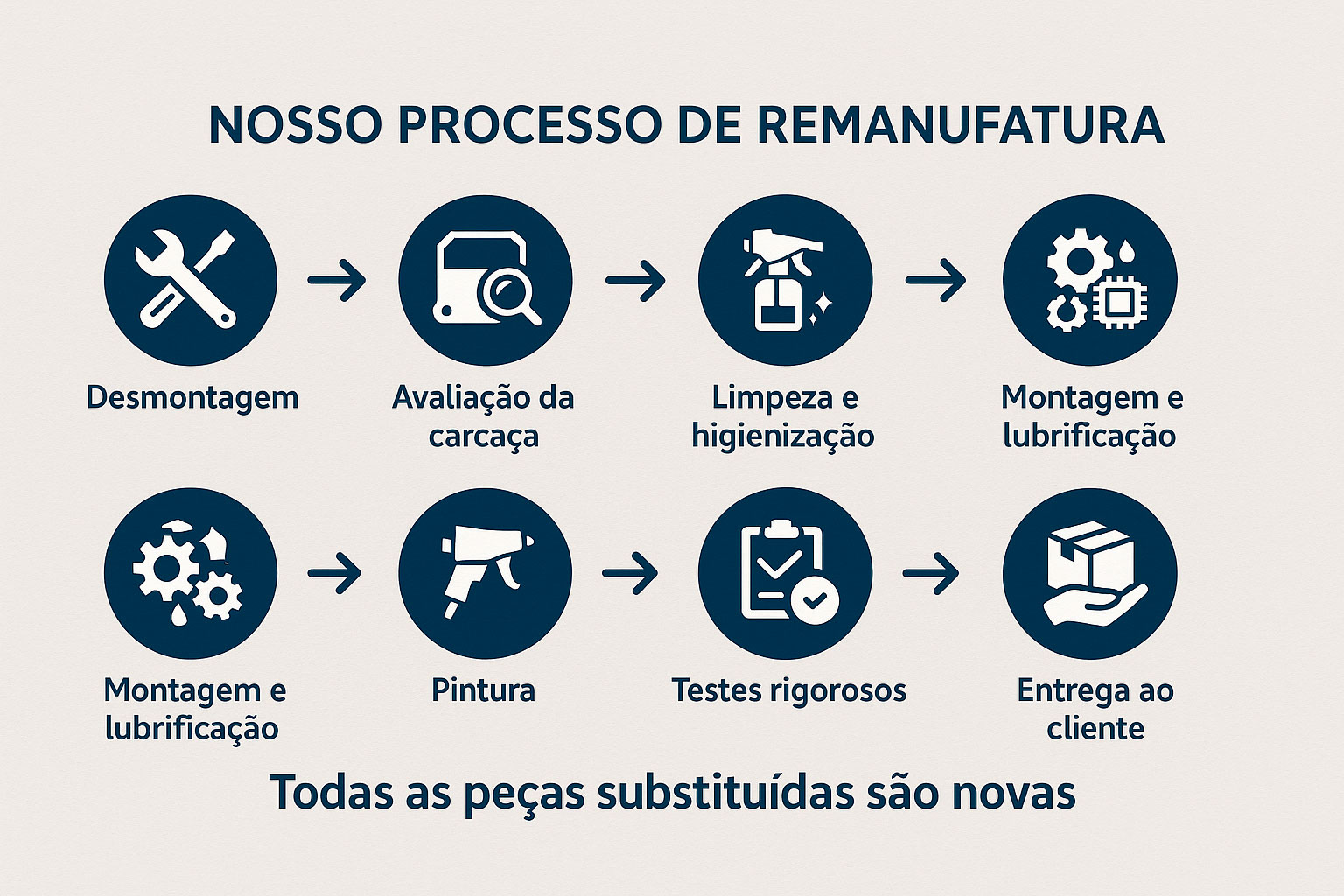 Desmontagem, avaliação da carcaça, avaliação dos componentes, limpeza e higienização, substituição dos componentes, montagem, lubrificação, pintura, teste, e devolução ao cliente. Componentes mais trocados no processo de Remanufatura: Troca de